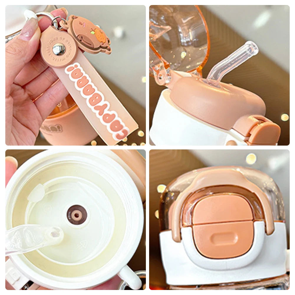 Cartoon Capybara Large Capacity Water Cup with Straw & Portable Strap Leakproof Drinks Bottle Portable Drinking Bottles for Kids Teen Girls Travel School Sports