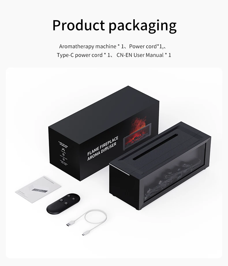 Function: Aroma oil atomization, no water intelligent shutdown, colorful ambient lighting & realistic fireplace night light,Self-contained remote control