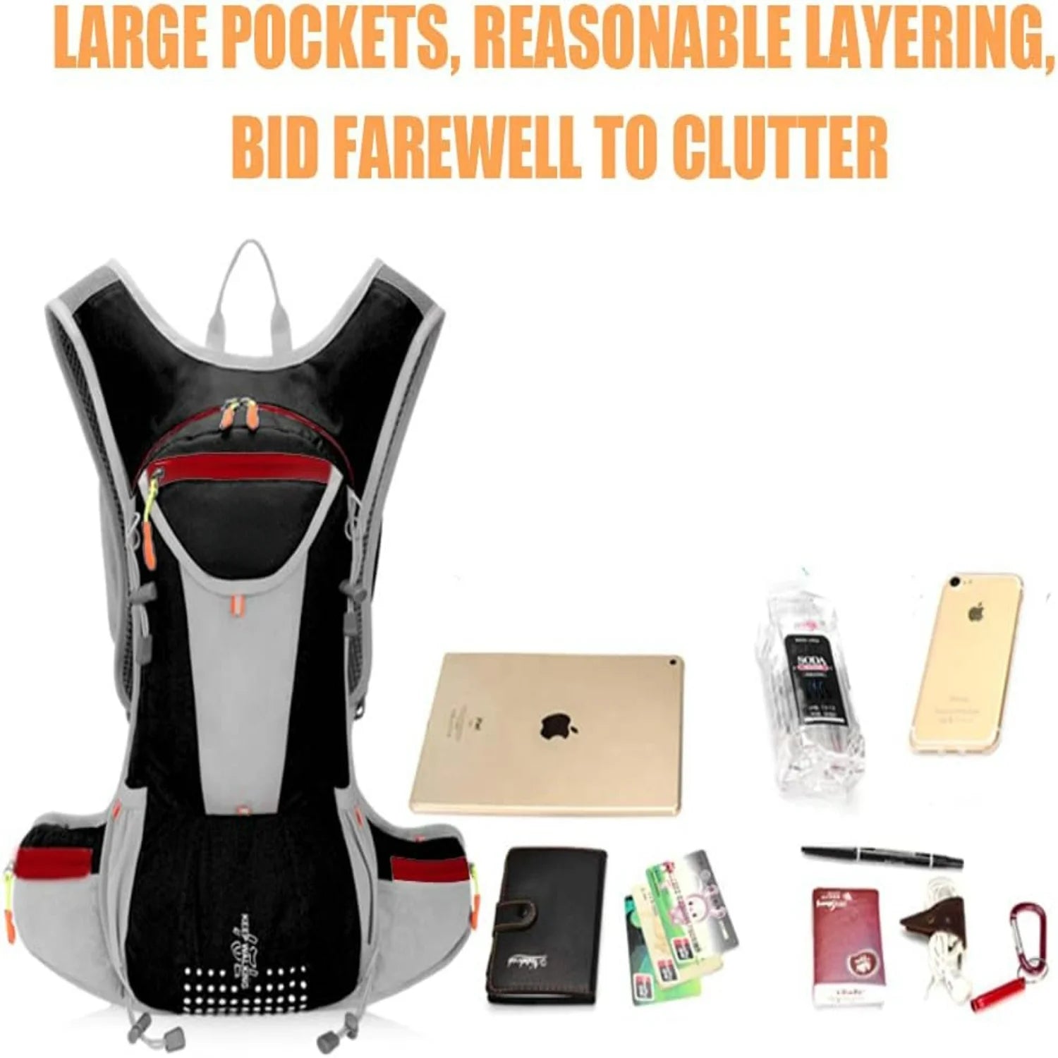 MULTIPLE STORAGE COMPARTMENT: Large capacity,biking backpack designs with multiple pockets that can store clothes, snacks, books, ipads or other objects,the differently sized pockets will suit all your storage needs perfectly as required.EASY DRINKING SYSTEM: Can be used as a hydration backpack, suitable for 2 liters water bladder, special hole designed for water bladder.