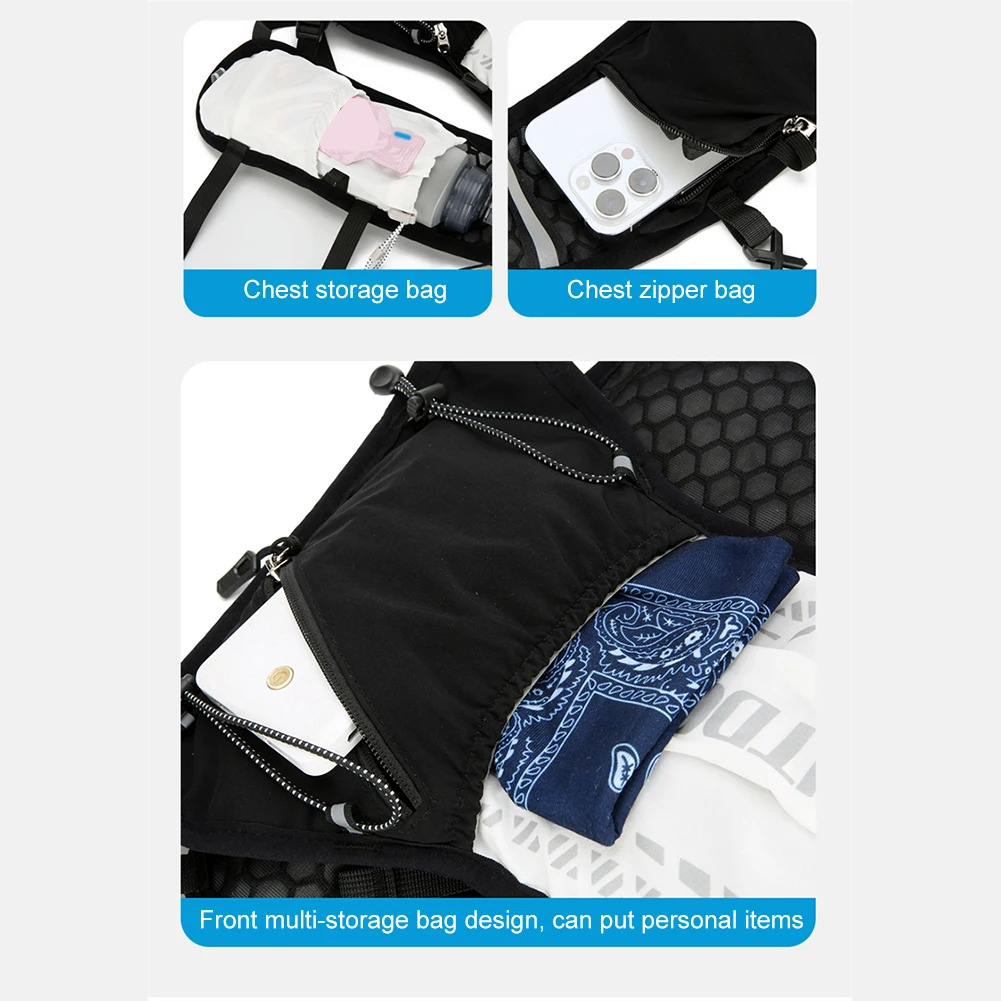 Features: 1. Sturdy Water-Resistant Fabric: Crafted from abrasion-resistant and water-repellent material, this hydration running vest withstands wind and rain, allowing for worry-free travel in any weather. 2. Breathable Comfort System: Featuring a breathable mesh back panel, this lightweight running vest ensures ventilation during activity, keeping you cool and comfortable while you run. 3. Reflective Safety Strips: Designed with reflective strips on the front and back, this hydrations backpack enhances visibility for safer nighttime running. 4. Ultra-Lightweight Design: Made from lightweight materials, this water bladder daypack is lighter than a smartphone, reducing the burden during your runs. 5. Multiple Storage Pockets: Equipped with multiple compartments, this outdoors hydration pack offers organized storage and easy access to your essentials, keeping your items neat and within reach. Specification: Origin: Mainland China Description: Suitable for short and medium marathons, can only hold small water bags, not large water bags on the back. Main Material: Nylon Color: Pink, Dark Blue With Orange, Dark Blue With Gray, Green, Black, Black With White Size: Approximately 36cm (14.17in)*17cm (6.69in) Net Weight: Approximately 160g