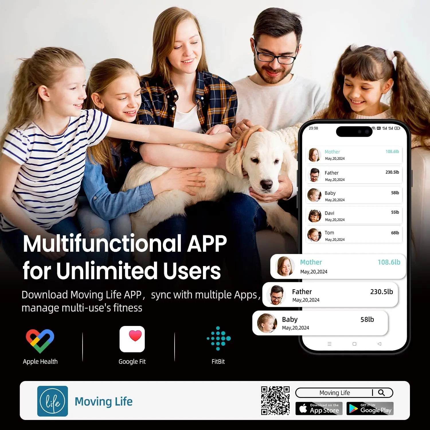 Accurate Measurement: This smart scale utilizes eight electrodes and dual-frequency technology to deliver precise body composition analysis. It measures five segments—arms, legs, and torso—for detailed insights into fat and muscle distribution. Maximum capacity is 400 lbs with a division of 0.1 lb for fine-tuned tracking. Thorough Body Composition Analysis: Powered by bio-impedance technology, the scale provides comprehensive data including weight, body fat percentage, hydration levels, muscle mass, bone mass, BMI, and an overall body score. For best results, ensure proper posture when using the handle for measurements. Tracking Your Fitness Journey: Connect the scale to a free mobile app available on Google Play or App Store. After initial setup, data automatically syncs to the app whenever your phone is nearby. This feature makes it easy to monitor progress over time and adjust exercise plans accordingly. Smart Data Management for Family Health: Create multiple user profiles with auto-identification for each family member. Share fitness data effortlessly with loved ones and use the baby mode to track growth milestones. One scale offers detailed health reports beneficial for everyone in the household. Convenient Design and Durable Build: Features a large color VA screen for clear readability at a glance. The retractable handle extends up to 63 inches for easy storage and accommodates users of all heights. Constructed with 6 mm tempered glass and non-slip pads for enhanced safety and longevity. Powered by included AA batteries; dimensions are 13 x 11 x 1 inches. Usage Tips: For accurate readings, set correct personal information and choose between athlete or normal modes as needed. Review instructions before use and maintain proper posture during measurements. Applying body lotion can help keep skin moist to improve data collection accuracy.