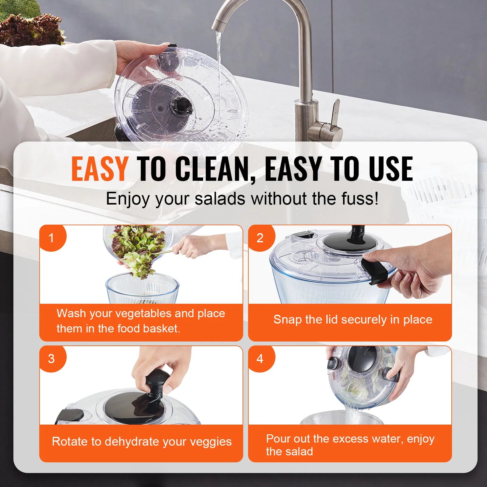 Effortless Cleaning Made Simple: Experience the ease of cleaning with our fruit spinner! Just wash your veggies, place them in the food basket, snap the lid shut, and give it a quick spin. For a thorough cleanup, you can easily detach the top and toss it in the dishwasher. No more scrubbing or soaking - it's a breeze to keep your vegetable spinner dryer sparkling clean.