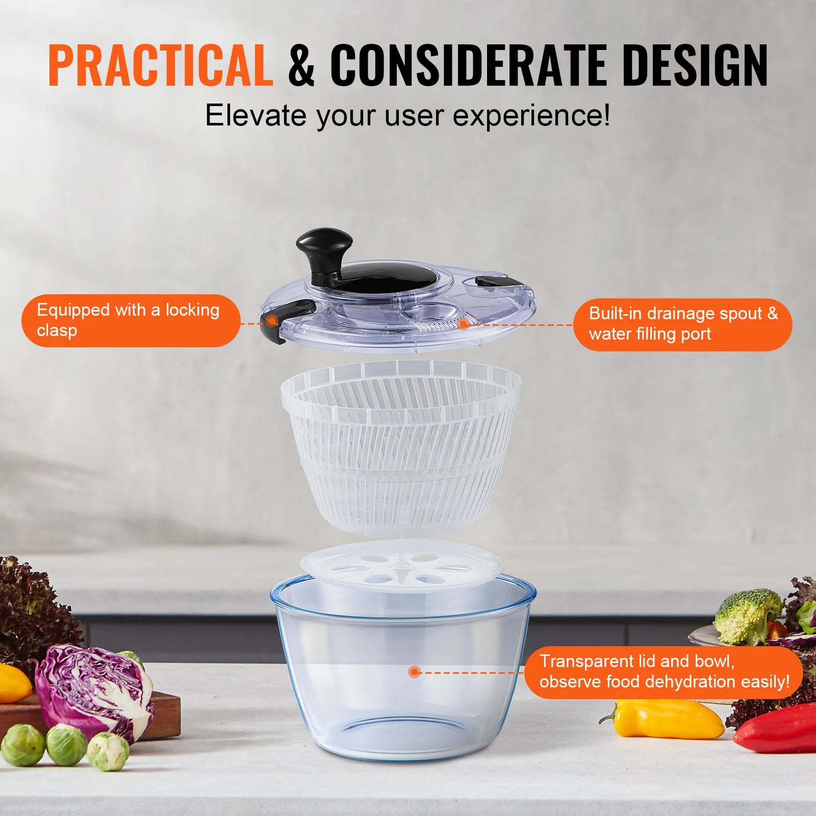 Practical Design for Your Convenience: The glass bowl doubles as a storage or mixing bowl, and the lid comes equipped with a drainage spout and a water filling port, making it easy to pour and clean. Plus, the lid features a secure locking mechanism, ensuring stability during spinning. The clear glass bowl and lid allow you to observe the progress of your ingredients as they dry, so you can achieve the perfect salad texture every time!